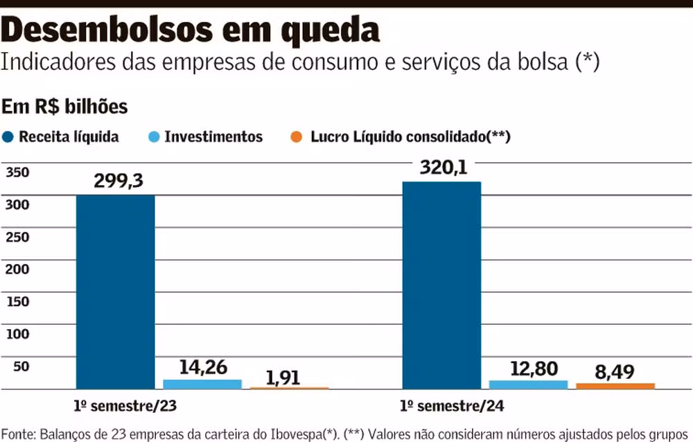 Nas companhias que fazem parte da carteira do Ibovespa, principal índice da bolsa, e que atuam na área de consumo de produtos e serviços, os investimentos representaram 3,9% da receita líquida de janeiro a junho, frente a um percentual maior, de 4,76% no mesmo período de 2023, segundo dados coletados em 23 empresas abertas, de consumo e serviços, incluídas no índice.